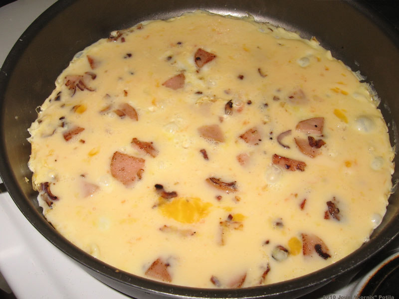 Ruskistin aluksi sipulinviipaleet rypsiöljyrasvassa ja lisäsin kuutioidut makkaranpalaset. Lisäsin mausteita. Sekoitin kananmunien rakenteen rikki erillisessä isossa kahvikupissa ja lisäsin sekaan maitoa. Kaadoin seoksen pannulle ja odotin, kunnes munakas olisi valmis käännettäväksi. Hetken koittaessa totesin, että on jälleen kerran paljon helpompaa tehdä koko ruuasta munakokkelia kuin yrittää kääntää suurta munakasta.
