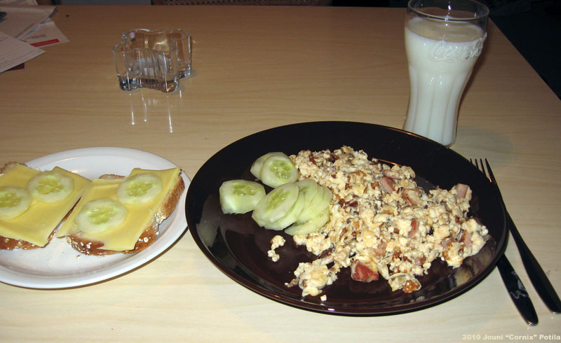 Valmis munakokkeli lautasella kurkkuviipaleiden kera. Lisäksi vaaleaa leipää ja ruokajuomaksi rasvatonta maitoa.